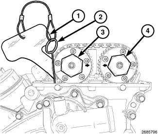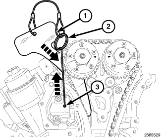 9. Using (10200-3) (2), lift the pawl off of the rack (3). While holding the pawl off of the rack, push (10200-1) (1) into place between the cylinder head and the cam chain guide to force the rack and piston back into the tensioner body. The holder remains in place while the phasers are removed Service and Repair.