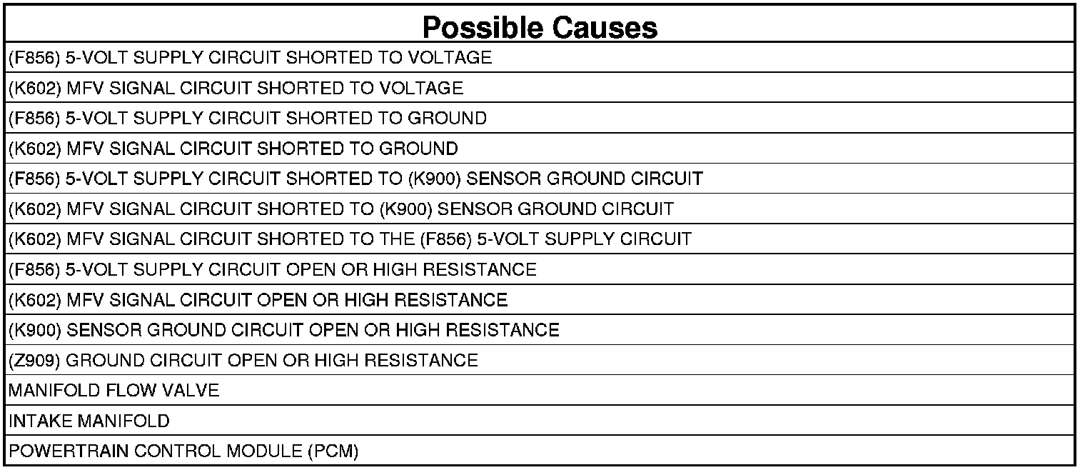 13. (K602) MFV SIGNAL CIRCUIT SHORTED TO THE (F856) 5-VOLT SUPPLY CIRCUIT