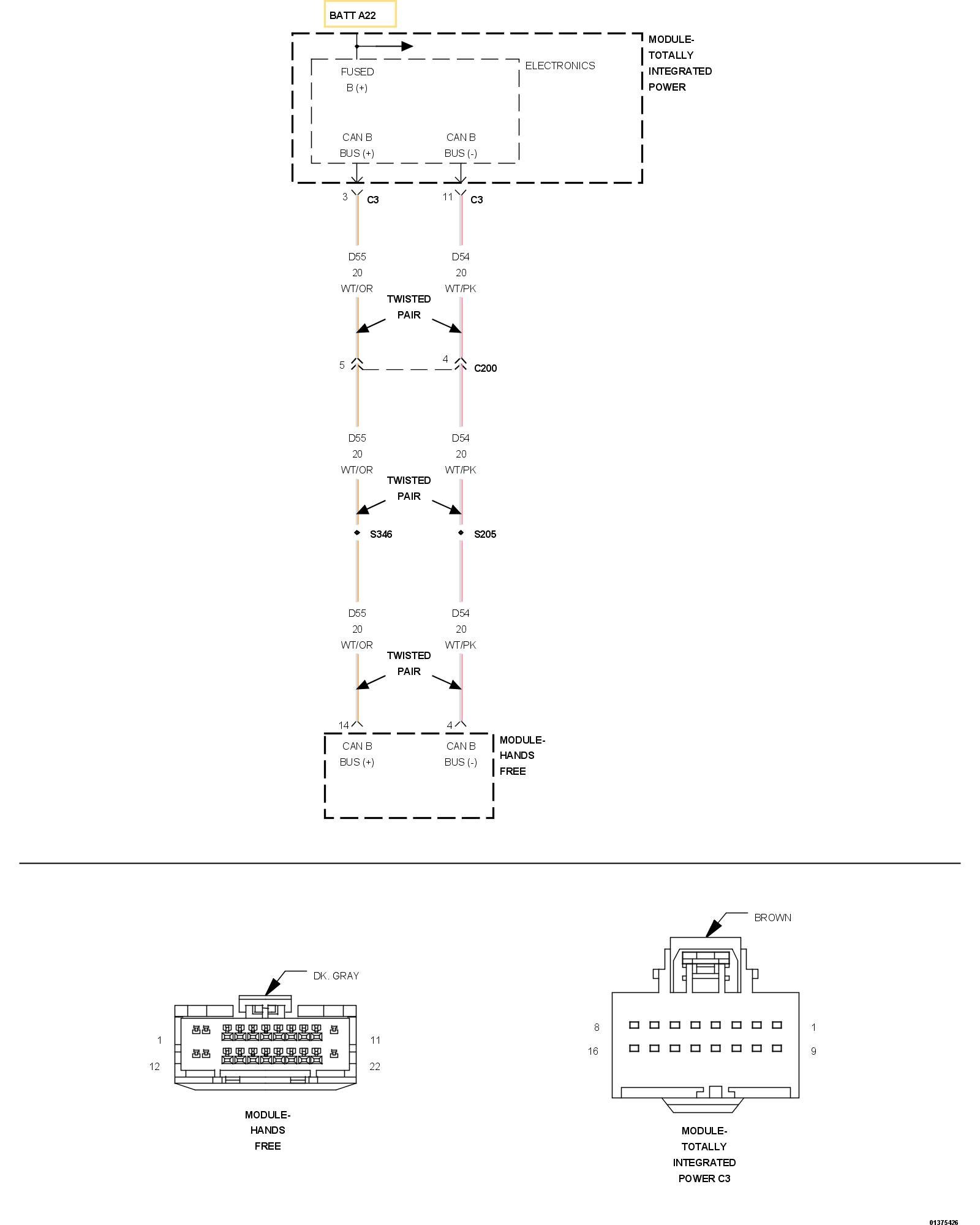 5. Measure the resistance of the (D55) CAN B Bus (+) circuit between the Totally Integrated Power Module connector and the Hands Free Module connector.