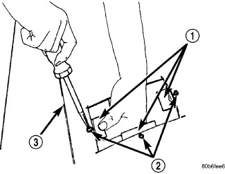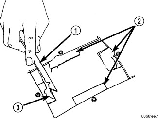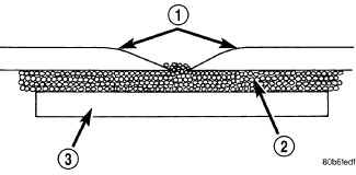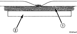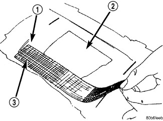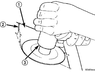 17. Using a 125 mm (5 in.) 24 grit disc grinder (3), grind a 50 mm (2 in.) to 75 mm (3 in.) wide and 2 mm (0.080 in.) deep path across the gaps (2) around the patch (1). With compressed air, blow dust from around patch.