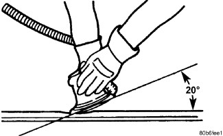 When repairing plastic, the damaged area is first "V'd" out, or beveled. Large bonding areas are desirable when repairing plastic because small repairs are less likely to hold permanently. Beveling the area around a crack at a 20° angle will increase the bonding surface for a repair. It is recommended that sharp edges be avoided because the joint may show through after the panel is refinished.