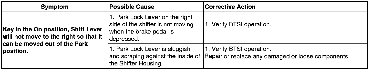 The Shift Interlock Cable is attached to a lever within the Shifter that prevents the Shift Lever from moving out of "Park" without the key. The Shift Interlock Cable adjustment is preset at the factory. When properly adjusted, the Shift Interlock System prevents the key being removed from the Key Cylinder when the Shift Lever is in a position other than "Park". The Brake Transmission Shift Interlock (BTSI) system prevents the shifter from being moved unless the brake pedal is applied.