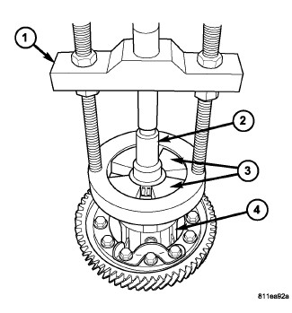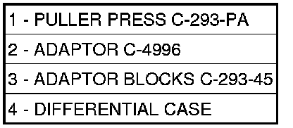 1. Remove differential bearing cones (ring gear and differential case side) using Puller (1)(Figure 1), Adapter Blocks (3), and Adaptor (2).