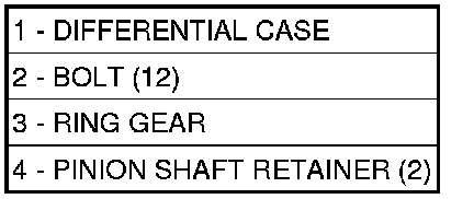 2. Remove the bolts holding the pinion shaft retainer (4) and the ring gear (3) to the differential case (1).