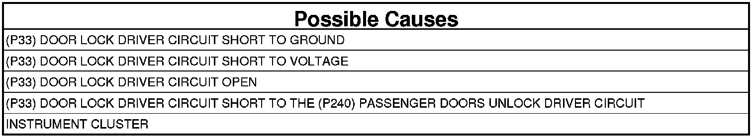 - Repair the (P33) Door Lock Driver for a short to the (P240) Passenger Doors Unlock Driver circuit.
