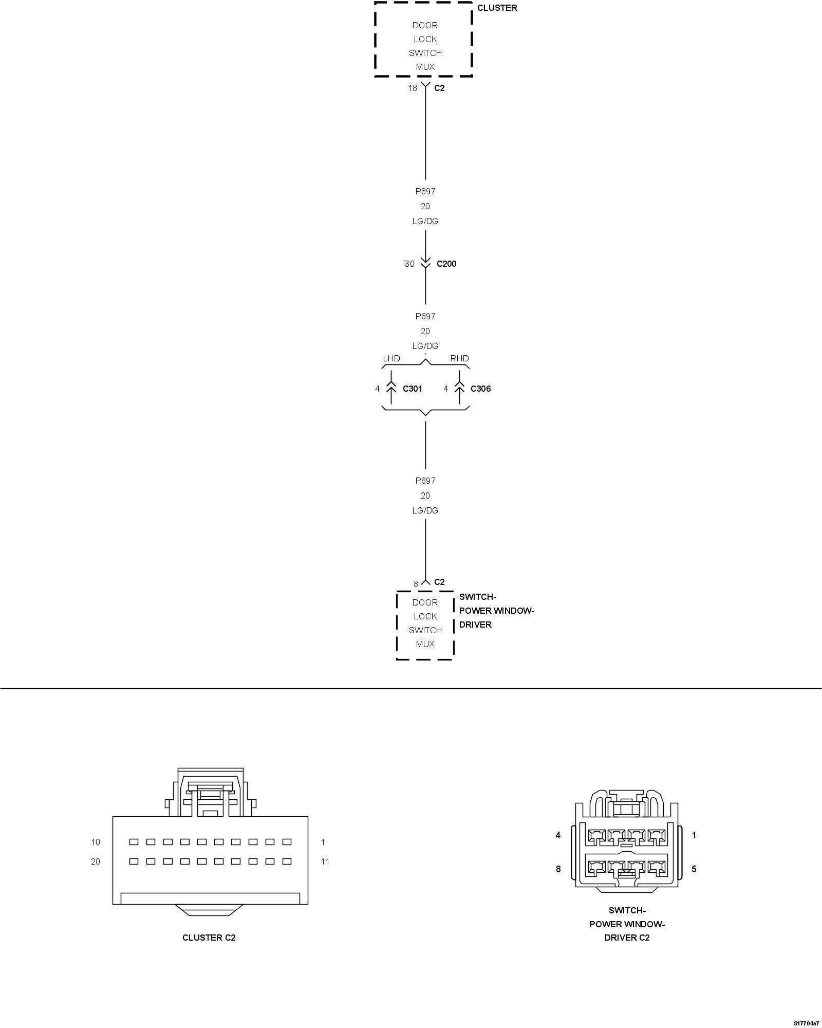 1. Measure the resistance of the (P697) Door Lock Switch Mux circuit between the Cluster C2 connector and the Driver Window/Door Lock Switch connector.
