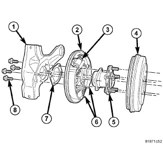 3. Install the four bolts (8) securing the hub and bearing (5), support plate (2), and spacer (7) to the trailing link (1). Tighten the mounting bolts to 105 Nm (77 ft. lbs.).