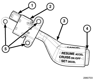 The switch housing, control stalk and push button are all constructed of molded plastic. The end of the control stalk has white text and graphics applied to it, which clearly identify each of the stalk and push button functions. The switch housing is secured through three integral mounting tabs (5) within the steering wheel hub by three screws. A connector receptacle (1) integral to the inboard end of the switch housing connects the speed control switch to the vehicle electrical system through a dedicated take out and connector of the steering wheel wire harness.