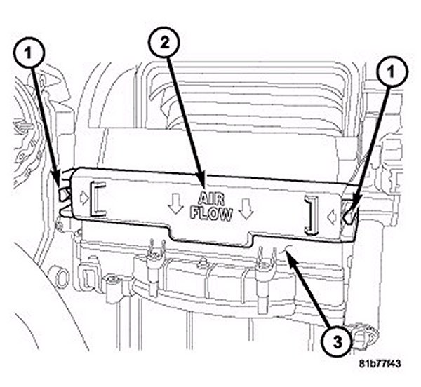 2. Position the particulate air filter cover (2) to the HVAC housing (3) and engage the two retaining tabs (1) that secure the cover to the housing. Make sure the retaining tabs are fully engaged.
