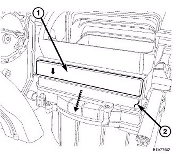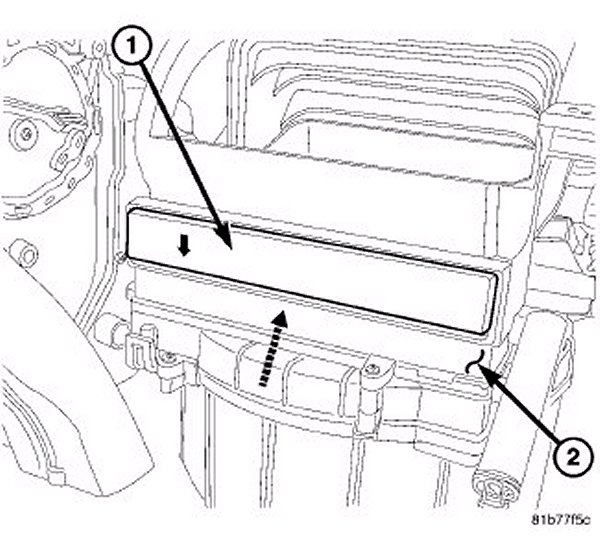 1. Install the particulate air filter (1) into the filter opening in the HVAC housing (2). Insert the particulate air filter directly into the housing with the arrow on the filter pointing to the floor.