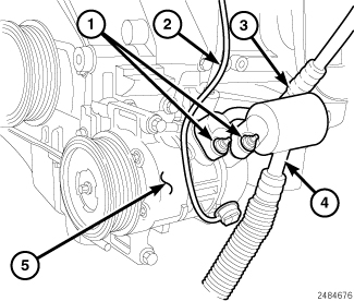 6. Connect the A/C discharge line (3) and the A/C suction line (4) to the A/C compressor (5).