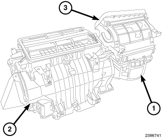 - Air distribution housing - The air distribution housing (2) is mounted to the rear of the HVAC housing and contains the heater core, blend-air and mode-air doors and door linkage.
