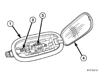 3. Swing the notched end of the lens (4) up into position against the housing, then press upward on the lens firmly and evenly until it snaps into the housing.