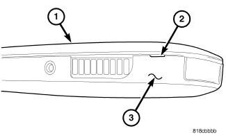 4. Install the new battery by sliding it between the latch tab and the case until it is engaged by the latch tab. The battery must be installed with the positive (+) terminal oriented toward the upper case (3).