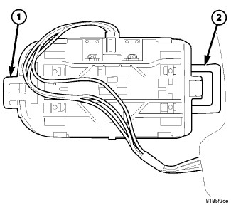 2. As shown from the backside, insert the unit tab (2) up into the headliner to the left first of all. Then push up the right side up into the headliner. The lens tab (1) will hold up the right side of the courtesy/reading lamp unit.