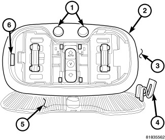 NOTE: When installing the lens (5), make sure that the tab on the lens (4) is inserted on the right side of the courtesy/reading lamp unit first.