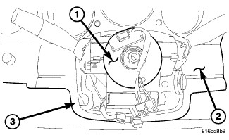 The left (lighting) multi-function switch is located on the left side of the steering column, just below the steering wheel. This switch is the primary control for the interior and exterior lighting systems. The only visible components of the switch are the control stalk (2), control knob (1) and control sleeve (3) that extend through the steering column shrouds on the left side of the column. The remainder of the switch including its mounting provisions, its electrical connection, and the turn signal cancel actuator are concealed beneath the shrouds.