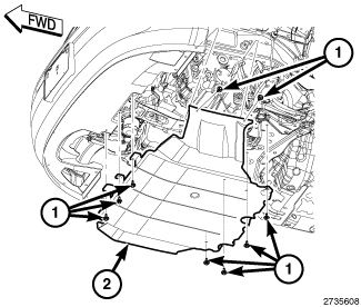1. Install the lower starter mounting bolt (1) and remove the starter (2).