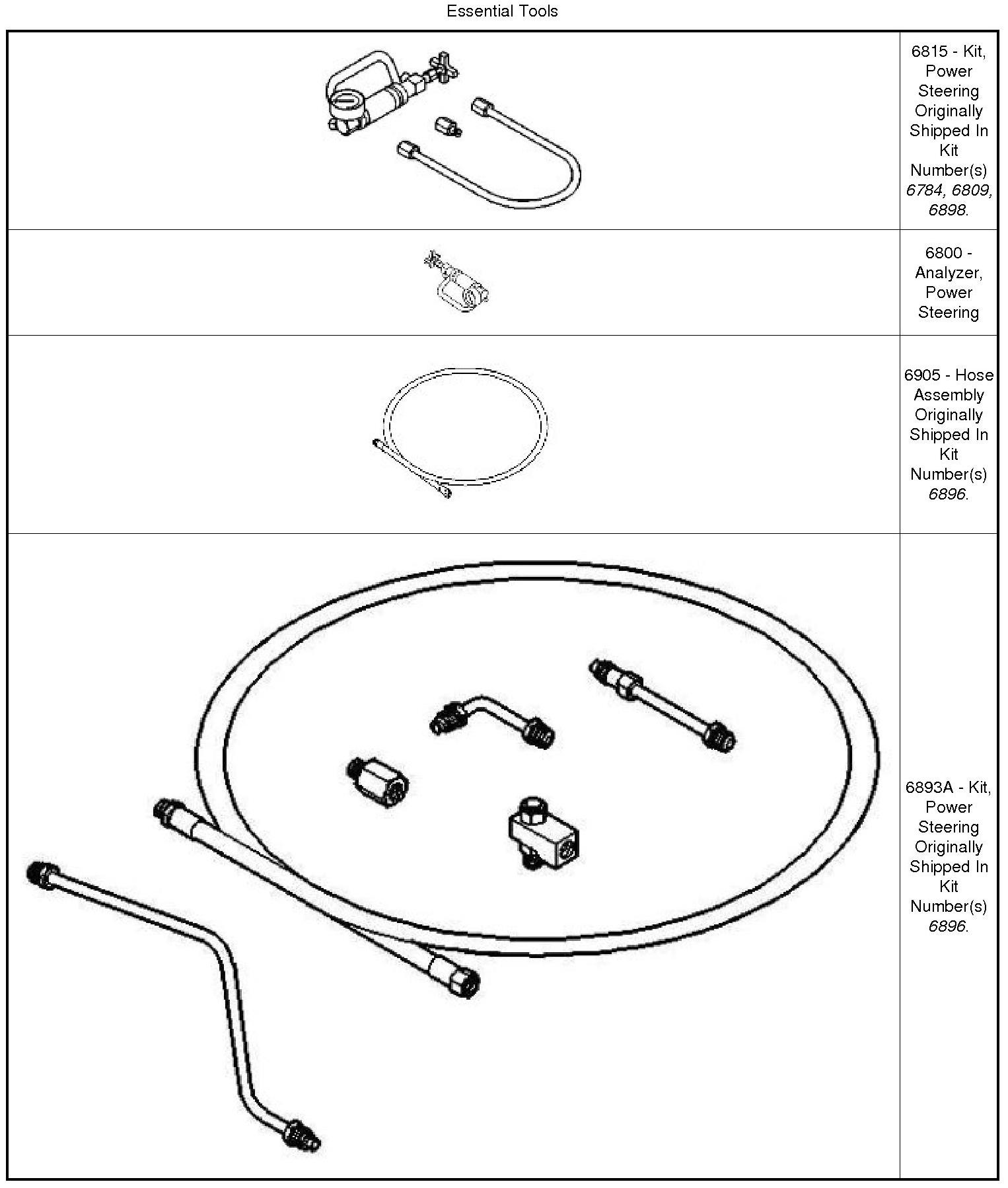 The following procedure is to be used to test the operation of the power steering system on this vehicle. This test will provide the flow rate (Gallons Per Minute (GPM)) of the power steering pump along with the maximum relief pressure. Perform this test any time a power steering system problem is present. This test will help determine if the power steering pump or power steering gear is not functioning properly. The test is performed using tools in the Power Steering Analyzer Kit with appropriate hoses and adapters. Tools and Equipment
