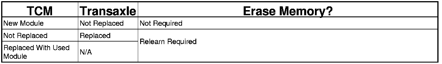 NOTE: Refer to the following table when the Transmission Control Module (TCM) and/or transaxle has been replaced to determine if the TCM memory must be erased.