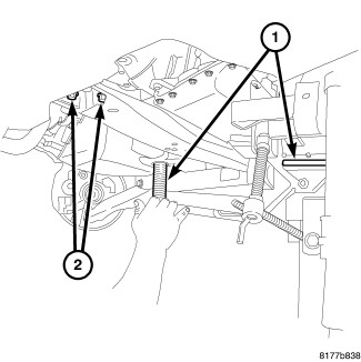 34. Remove the transmission rear mount thorough bolt (2).