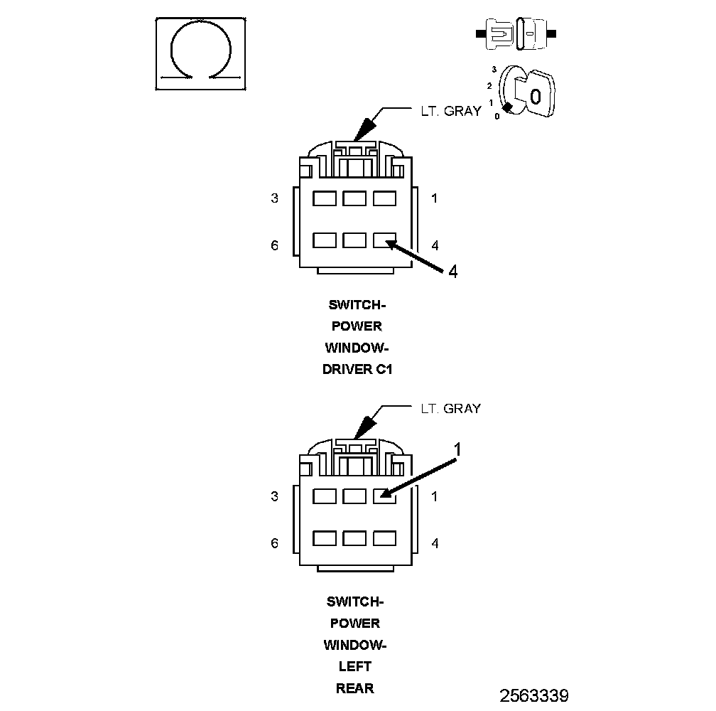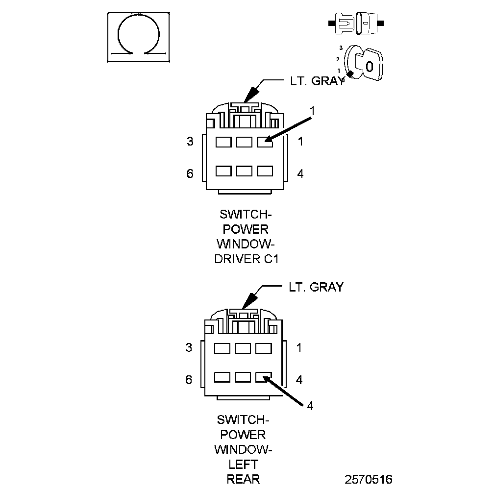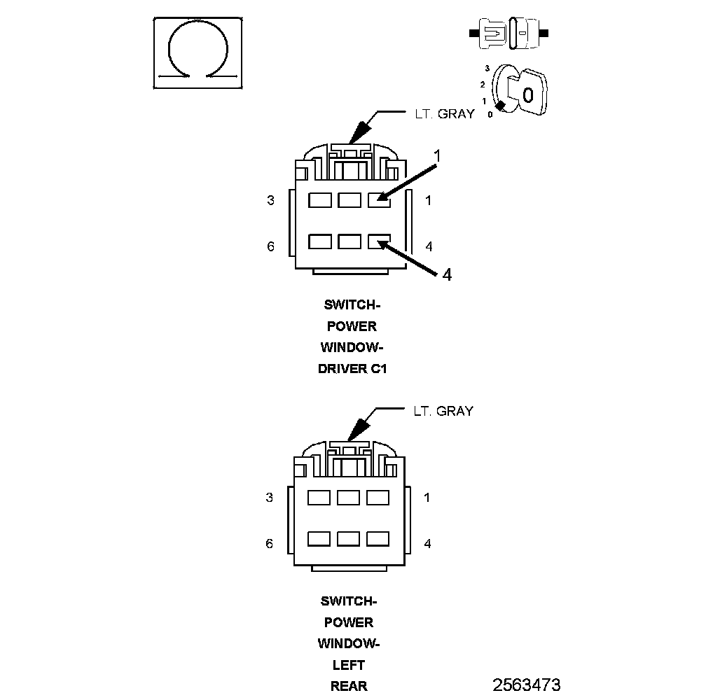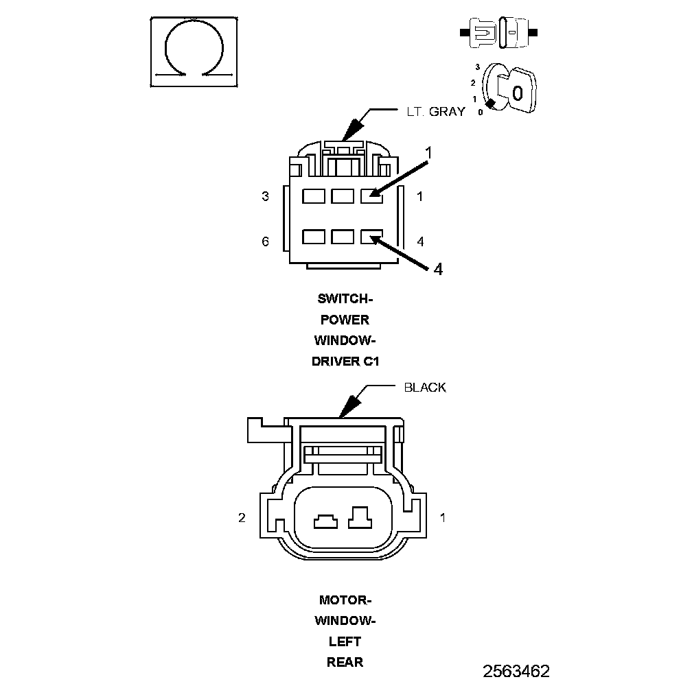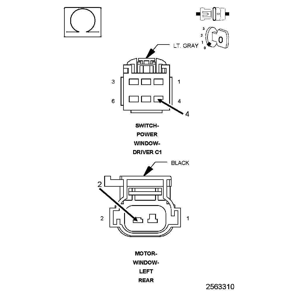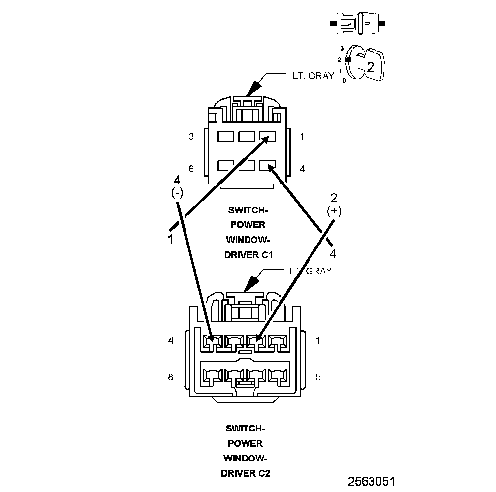 3. Connect a Jumper wire between the Ignition Switch Output circuit (cavity 2 in the Driver Switch C2 connector) and the Master Window Switch Left Rear (Down) circuit (Cavity 4 in the Driver Switch C1 connector).