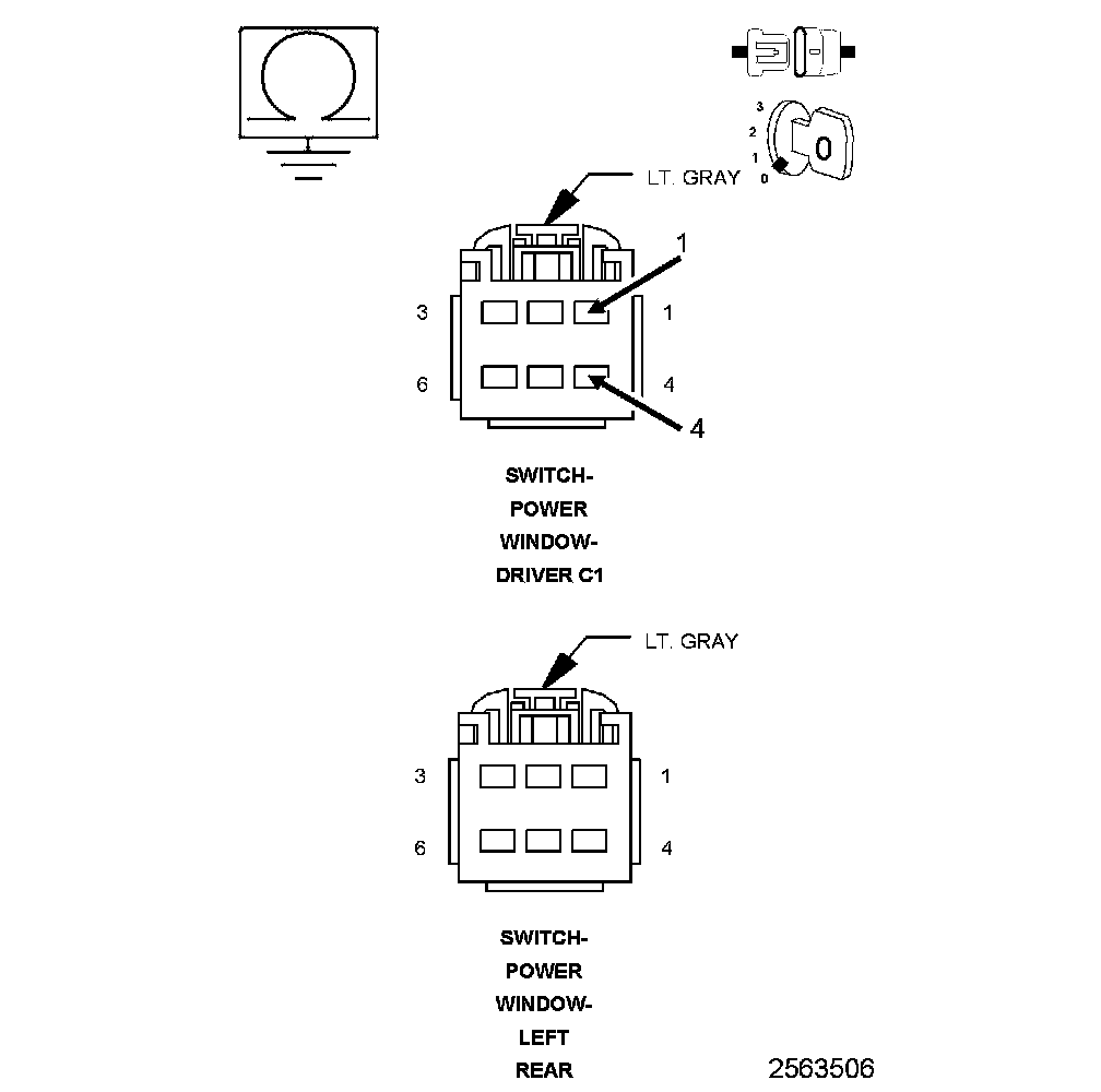 4. Connect a Jumper wire between the Master Window Switch Left Rear (Up) circuit (Cavity 1 in the Driver Switch C1 connector) and momentarily touch it to the Ground circuit (cavity 4 in the Driver Switch C2 connector). Reverse the wires at the C1 connector if there is a short to ground.