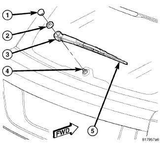 1. The rear wiper arm (3) must be indexed to the motor output shaft (4) with the rear wiper motor in the park position to be properly installed. Position the wiper arm pivot end onto the output shaft so that the wiper blade (5) is aligned with the lowest horizontal line of the rear window defogger grid.