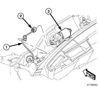 5. Reconnect the wire harness (1) connector to the connector receptacle for the front wiper motor (3) and engage the routing clip onto the stud in the cowl plenum.