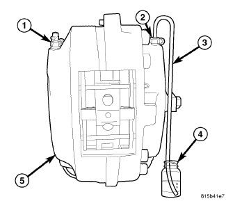 8. Attach a clear hose (5) to the outboard bleeder screw (1) at the brake caliper and feed the other end of hose into a clear jar (4) containing enough fresh brake fluid to submerge the end of the hose.
