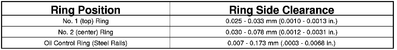 5. Measure the ring side clearance as shown. Make sure the feeler gauge (1) fits snugly between the ring land and the ring. Replace any ring not within specification.