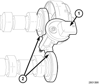 The Camshaft Position Sensors (CMP) sensors (1) are dual read, single element hall effect sensors mounted between the magnetic encoded timing wheels (2). The magnetic timing wheels are used because of their small diameter allowing for a compact cylinder head design.