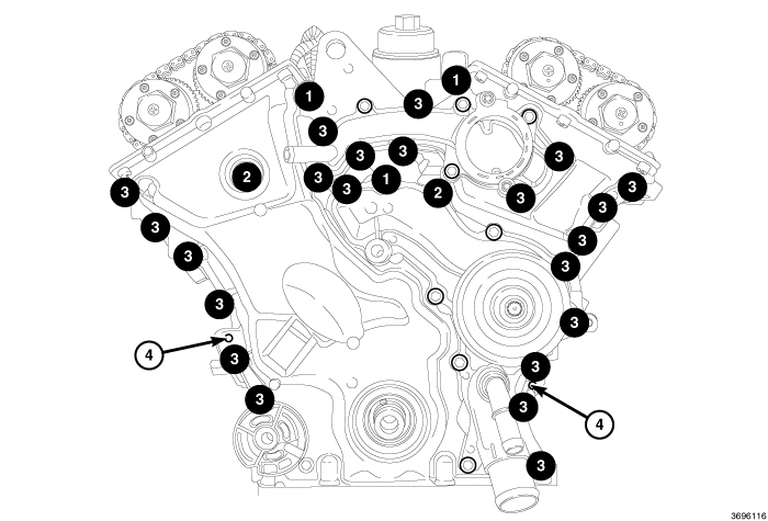 Apply a 2 to 3 mm wide bead of Mopar(R) Threebond Engine RTV Sealant to the front cover as shown in the following locations: