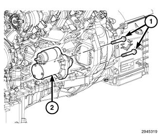 2. Install the starter mounting bolts (1) to the starter (2). Tighten the bolts to 55 Nm (40 ft. lbs.).