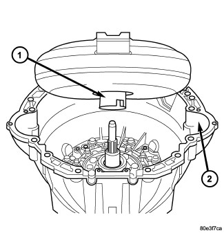 47. Position the torque converter (1) to the converter housing (2). Align torque converter to the transmission input shaft and oil pump drive and carefully install the converter.