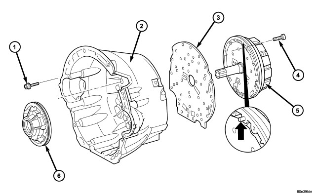 8. Install the holding clutch B1 (5) onto the converter housing and intermediate plate. Installed position of clutch B1 in relation to converter housing is specified by a plain dowel pin in clutch B1 (arrow).