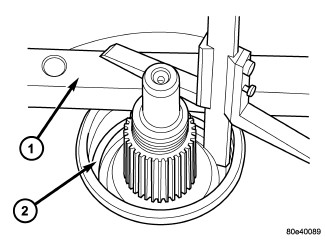 24. Using a depth gauge, measure from Gauge Bar (1) to the contact surface of the output shaft bearing (2) in the transmission housing.