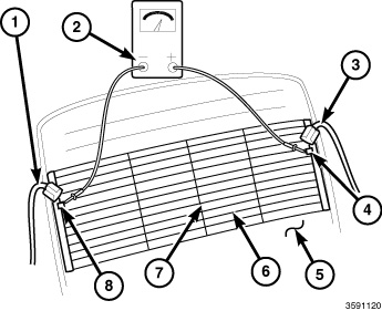 4. If a temperature difference is not detected, use a 12 volt Direct Current (DC) voltmeter and contact the rear glass heating grid terminal A (8) with the negative lead, and terminal B (4) with the positive lead. The voltmeter should read battery voltage. If the voltmeter does not read battery voltage, check the following: