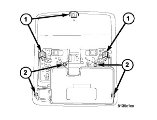 1. Position the universal transmitter onto the overhead console assembly and install the retaining screws (2).