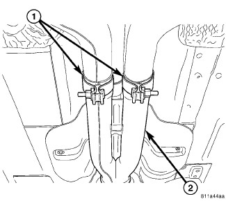 9. On each side of crossmember rear, guide leading end of rear parking brake through crossmember bracket (1 - left) (2 - right) near equalizer and press cable housing retainer into bracket allowing retainer fingers to lock cable in place.