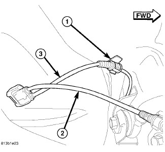 37. Clip left rear wheel speed sensor cable (3) to routing clip (1) near body connector.