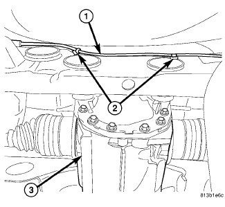 36. Clip left rear wheel speed sensor cable (1) to routing clips (2) along rear of crossmember near rear differential (3).