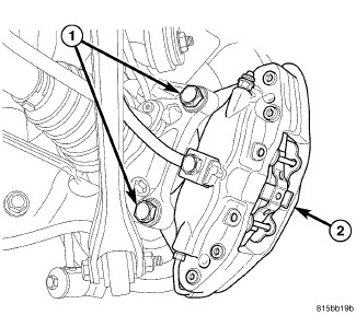 43. If equipped with SRT8 disc brakes, on each rear disc brake, install caliper mounting bolts (1). Tighten bolts to 130 Nm (96 ft. lbs.).