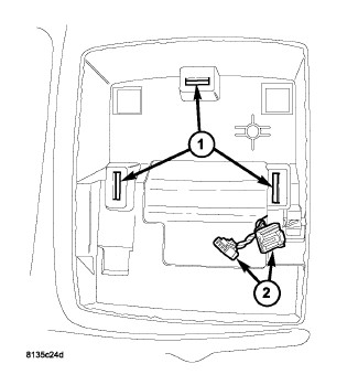 3. Align the snap clips on the overhead console housing with their receptacles (1) in the overhead console bracket.