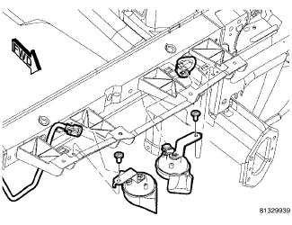 9. Install the horns onto the headlamp mounting crossmember. Tighten the bolts to 28 Nm (21 ft. lbs. ).