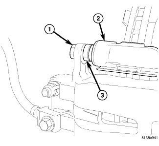 7. Install Upper caliper guide pin bolt (1). While holding guide pin (3) stationary tighten bolt to 60 Nm (44 ft. lbs.).