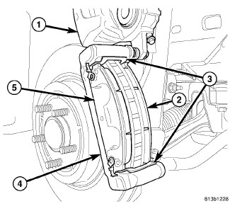 4. Install NEW inboard (2) and outboard (5) brake pads on caliper adapter (4). NEW Inboard and outboard pads are interchangeable.