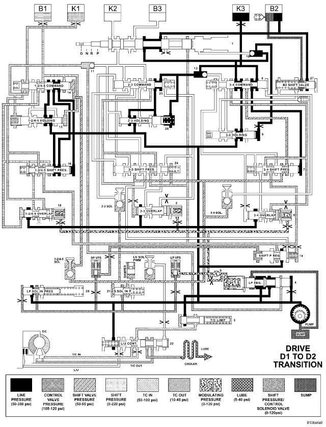 Figure 21 - HYDRAULIC FLOW IN DRIVE - SECOND TO FIRST GEAR TRANSITION