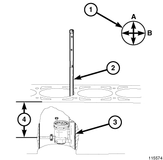 10. Measure the inside diameter of the cylinder bore at three levels below the top of the bore (4). Start at the top of the bore, perpendicular (across or at 90°) to the axis of the crankshaft at point A (1).