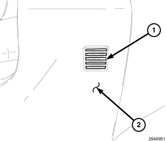 2. Place a small piece of newspaper in front of the aspirator motor opening grille (1), located on the steering column opening cover (2). If the paper sticks to the grille, the aspirator motor is operating properly. The piece of paper should be only large enough to cover the opening.